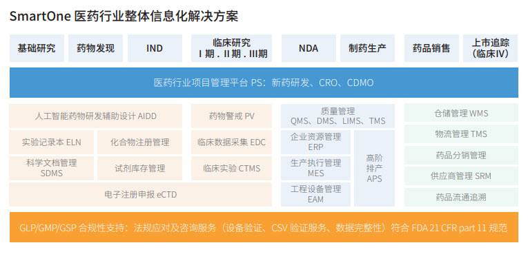 我們?yōu)槿虻纳镝t(yī)藥公司提供醫(yī)藥行業(yè)從研發(fā)到生產(chǎn)的整體信息化解決方案,基于公司自主研發(fā)產(chǎn)品“一智通SmartOne”。幫助生物醫(yī)藥公司實現(xiàn)數(shù)字化轉(zhuǎn)型,降低成本、保障品質(zhì)、提高效率。